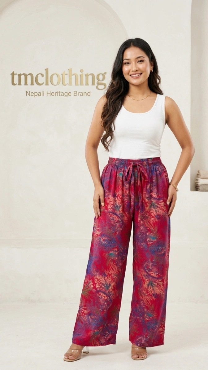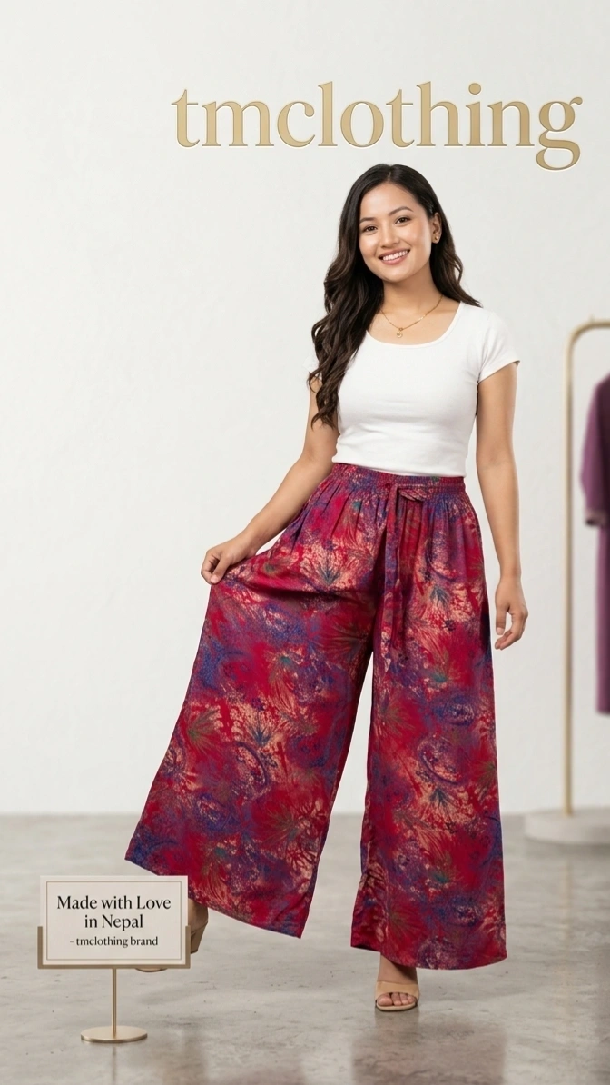 यो आकर्षक फ्लोरल प्रिन्ट भएको Wide Leg Palazzo Pant ले तपाईंको स्टाइललाई सहज र ट्रेन्डी बनाउँछ। हल्का र आरामदायी कपडाबाट बनेको यो प्यान्ट दैनिक प्रयोग, घुमफिर वा क्याजुअल आउटिङका लागि उपयुक्त छ। कम्मरमा adjustable डोरी भएकोले फिट सजिलै मिलाउन सकिन्छ। यसको wide-leg डिजाइनले आरामसँगै स्टाइलिश लुक दिन्छ। टप, कुर्था वा क्रप टपसँग सजिलै मिलाएर लगाउन सकिने बहुउपयोगी प्यान्ट हो।
