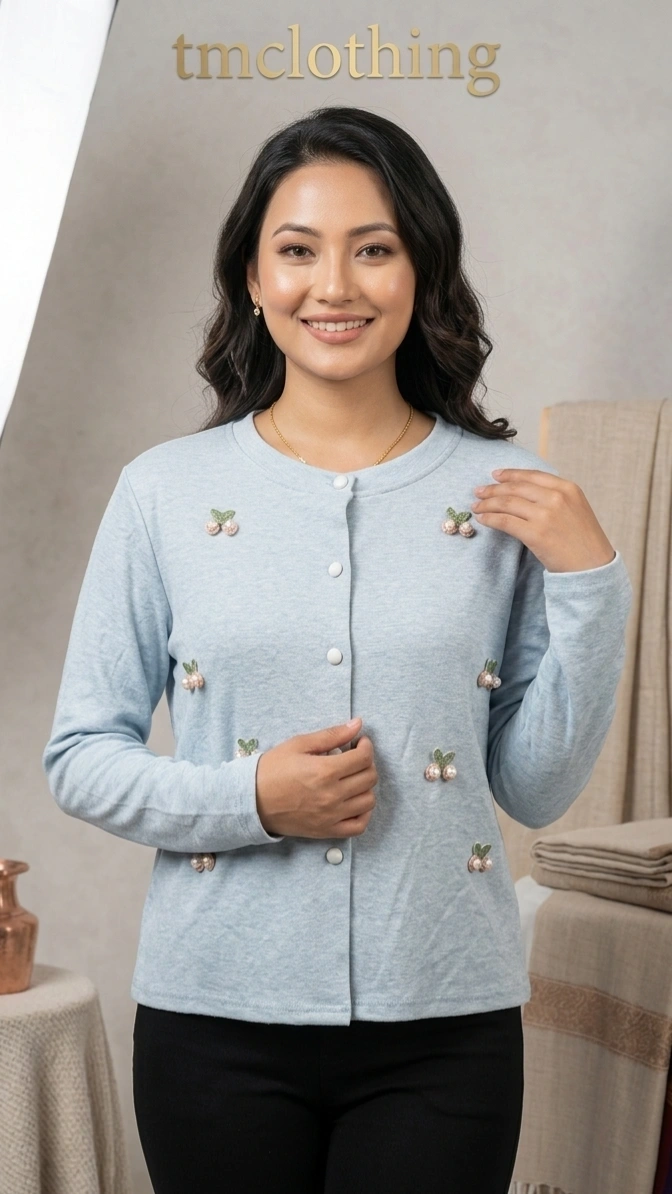 यो आकर्षक Embroidered Button Cardigan Top साधारण र stylish डिजाइन भएको आरामदायी टप हो। अगाडिको भागमा सानो embroidery detailing ले यसलाई unique बनाउँछ। Soft र breathable कपडाबाट बनेको यो टप दैनिक प्रयोग, अफिस वा casual outing का लागि उपयुक्त छ। Front button design भएकोले open वा close दुबै तरिकाले लगाउन सकिन्छ। Jeans, pant वा leggings सँग सजिलै match हुने versatile टप हो।