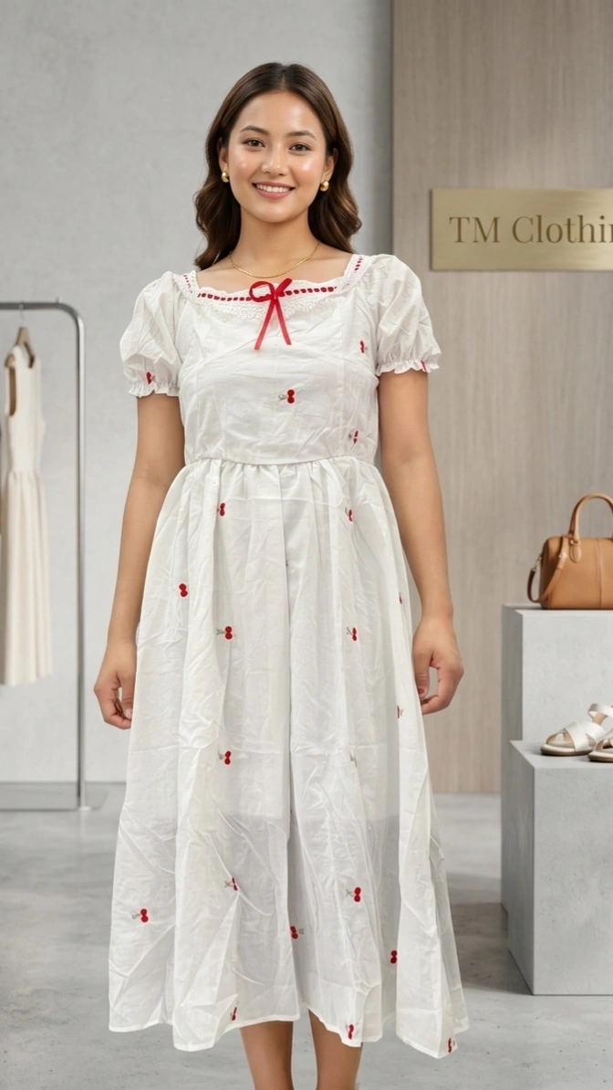 यो सुन्दर White Cherry Midi Dress हल्का, आरामदायक र स्टाइलिश डिजाइनमा तयार गरिएको छ। सेतो रंगमा साना रातो cherry embroidery ले dress लाई आकर्षक बनाएको छ। Soft fabric र breathable material भएकाले दैनिक प्रयोग, outing वा casual कार्यक्रममा लगाउन उपयुक्त छ। Puff sleeve design र ribbon detail ले feminine look दिन्छ भने midi length ले elegant style दिन्छ।