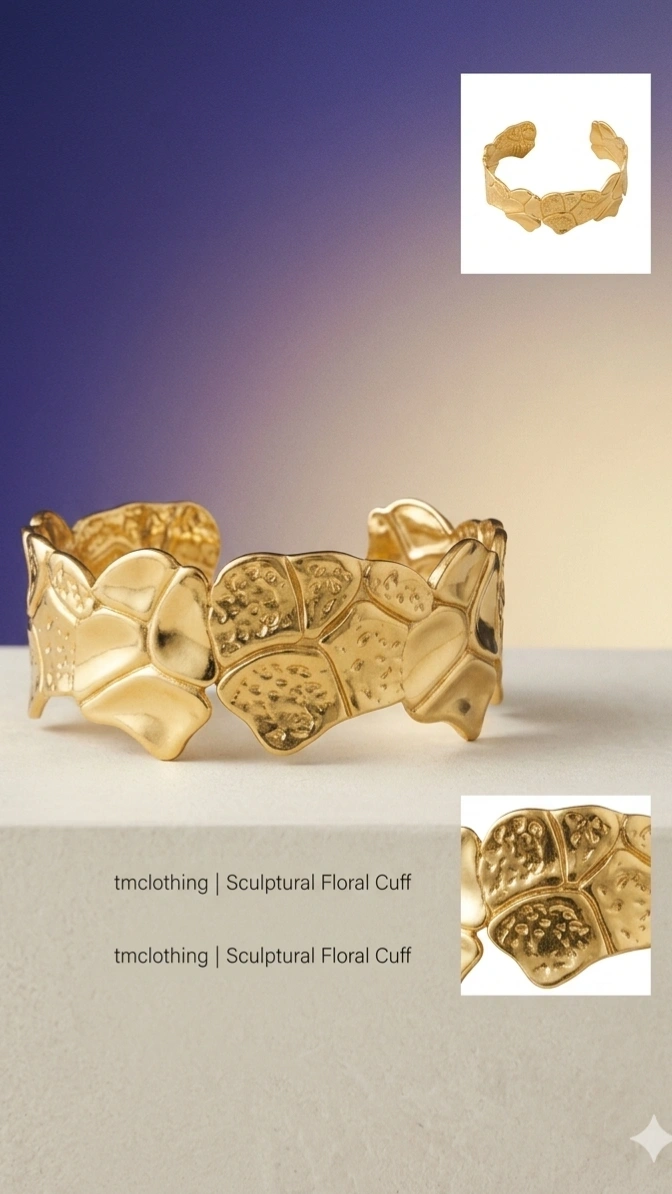 फूलको प्रेरणाबाट बनेको Sculptural Floral Cuff ले feminine र stylish look दिन्छ। यसको bold structure ले outfit लाई standout बनाउँछ।