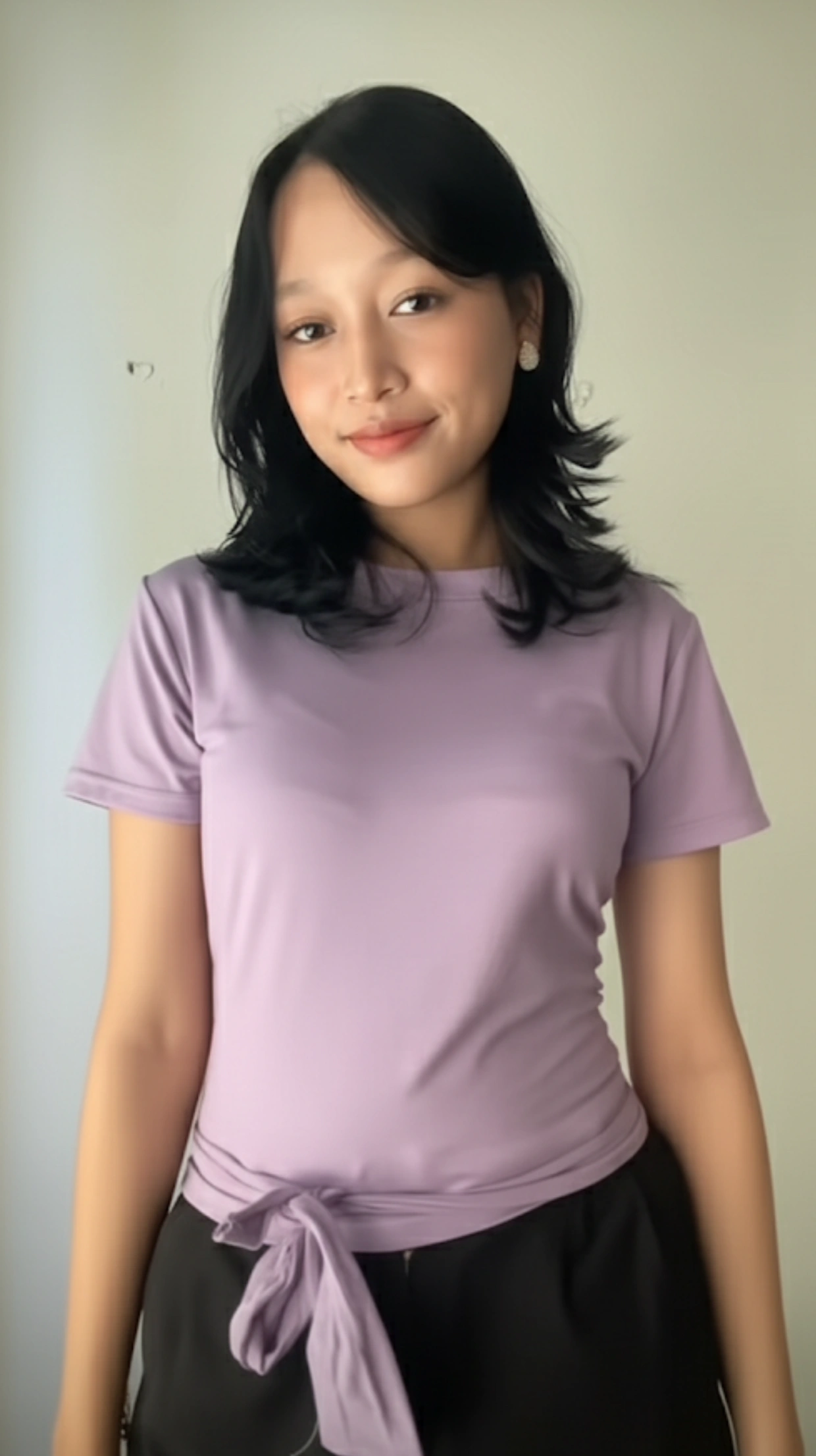 सादा ह्यान्डब्याग र सेतो स्निकरले क्याजुअल फिनिश दिन्छ
