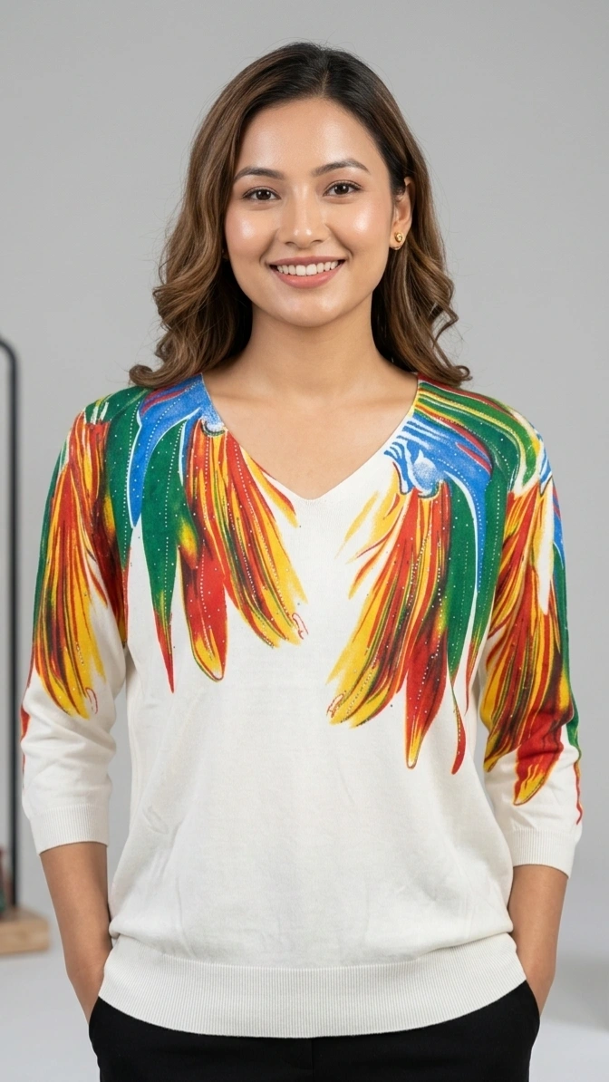 Jeans, trousers वा skirt सँग सजिलै match हुने यो टप lightweight र comfortable छ। Unique color combination भएकाले simple outfit लाई पनि standout बनाउँछ।